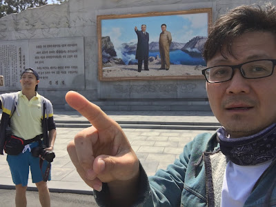Sampling the water from a well near Kim Il Sung's birthplace.